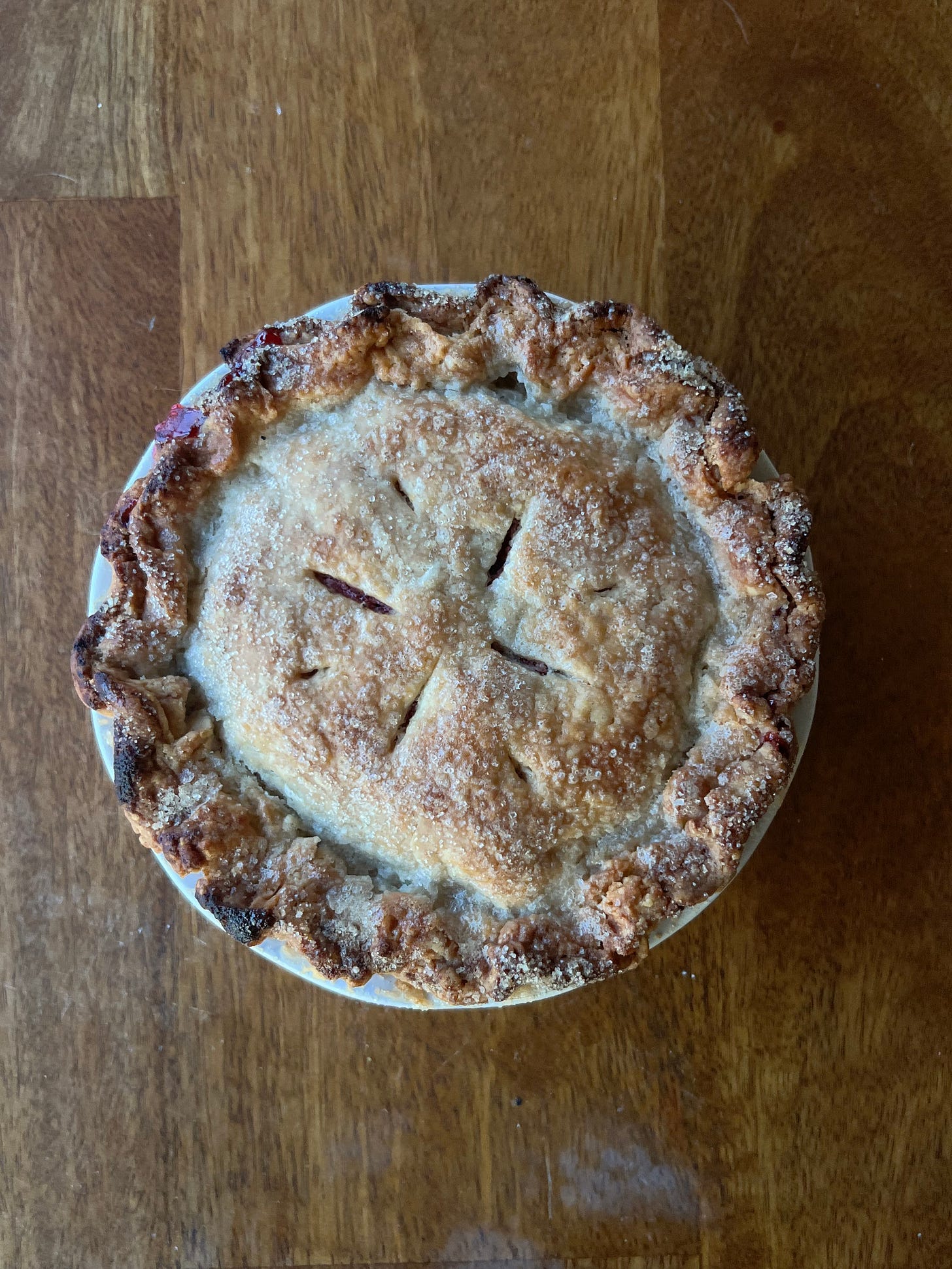 Our neighbor baked us a cherry pie after we watched her two dogs for the day. She walked it over from her place. It was wrapped in a yellow and cream tea towel, twisted tightly at the top. I tried to replicate the twist, but it’s a move that belongs to her, a former bakery owner. When she handed the pie over to me, it warmed the palm of my hands.